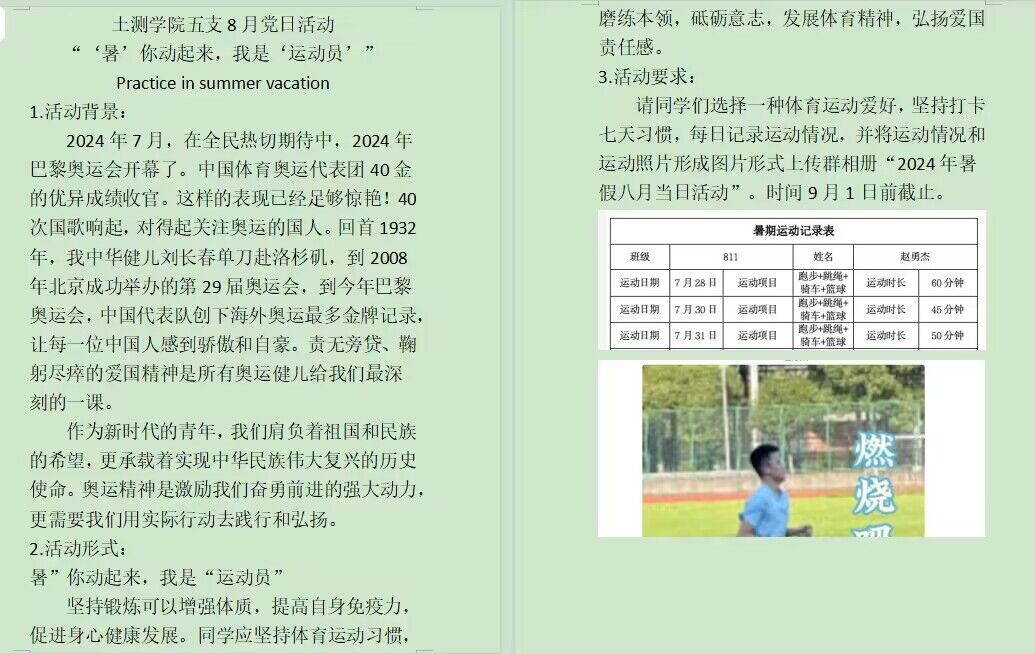 为弘扬中国健儿在巴黎奥运会中展现的团结、拼搏和奉献精神,激励党员同志以更高标准、更严要求提高自身素质,展现青春作为。我院学生第五党支部于2024年8月18日在线上开展“‘暑’你动起来,我是‘运动员’”主题党日活动。本次活动由支部书记石慧梅同志主持,支部全体党员同志参加。