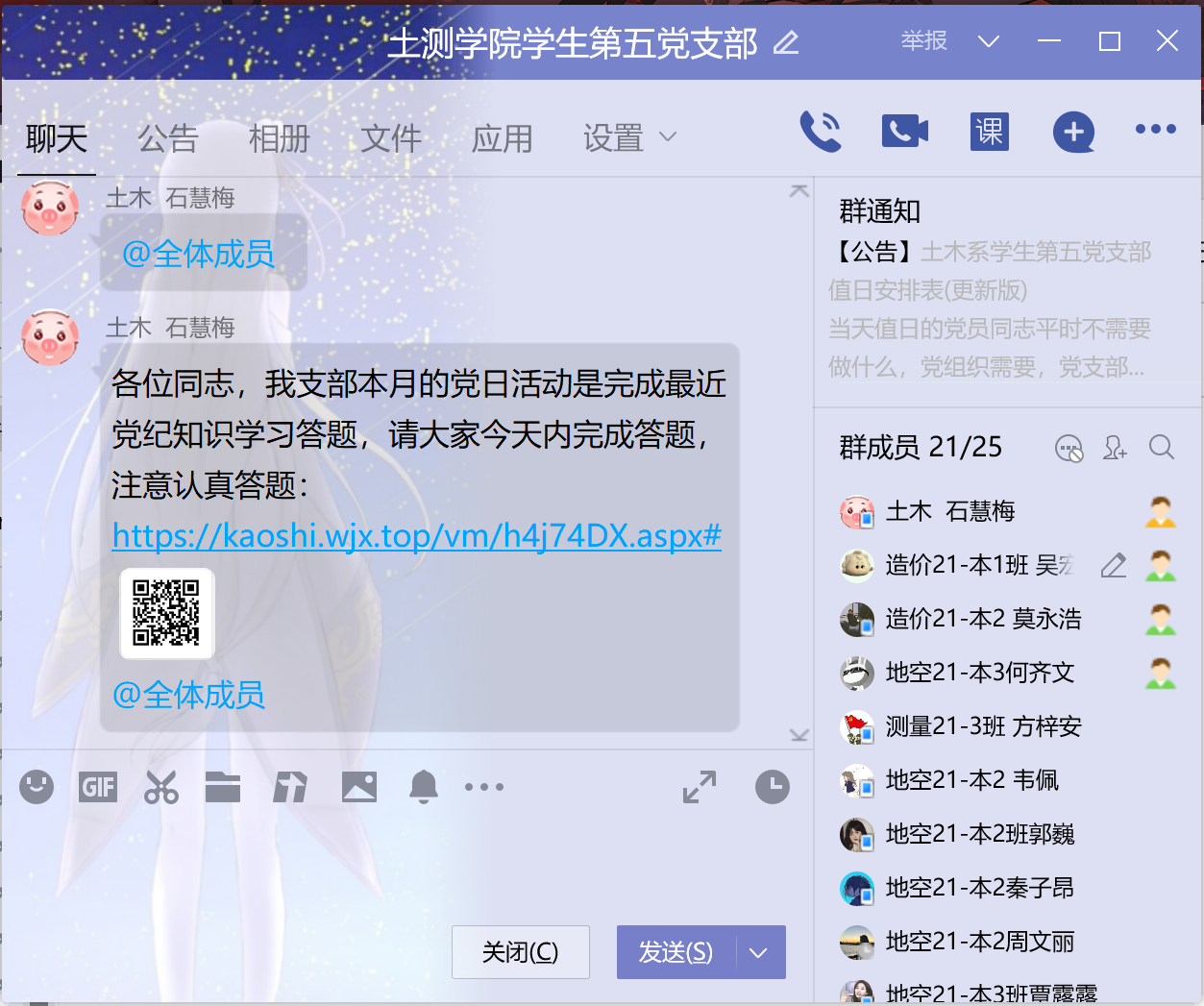 为推动深化党纪学习教育,深入开展学习新修订的《中国共产党纪律处分条例》主题教育。我系学生第五党支部于2024年7月10日在线上开展“党纪知识学习答题”主题党日活动。本次活动由支部书记石慧梅同志主持,支部全体党员同志参加。