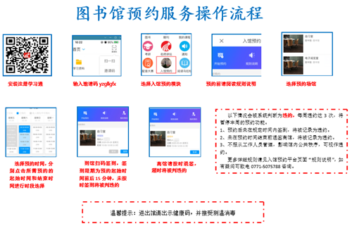 入馆预约规则详情可查看预约系统平台页面“使用规则”,如有疑问可致电图书馆服务总台:0771-5075788。