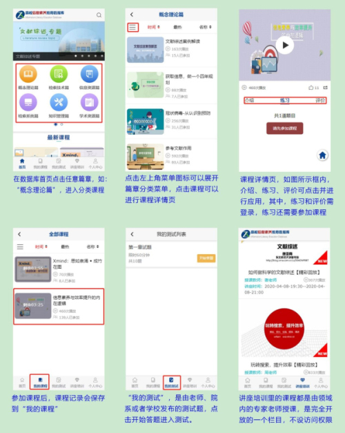 【首页】【我的课程】【我的测试】【讲座培训】【个人中心】 ,以下是对应功能应用的图示操作流程。