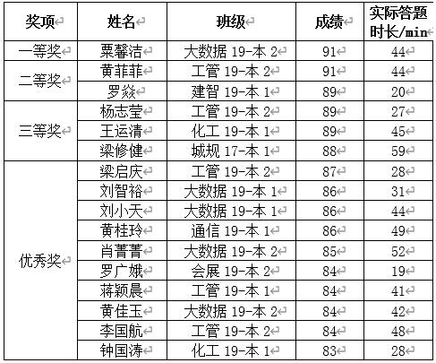 根据《关于举办首届信息素养大赛的通知》要求,图书馆主办的首届信息素养大赛于2020年10月9日——16日成功举行,本次比赛历时八天,共 500名同学报名参赛,经网络答题,竞赛系统评分,再经过评选,最终获奖名单公布如下: