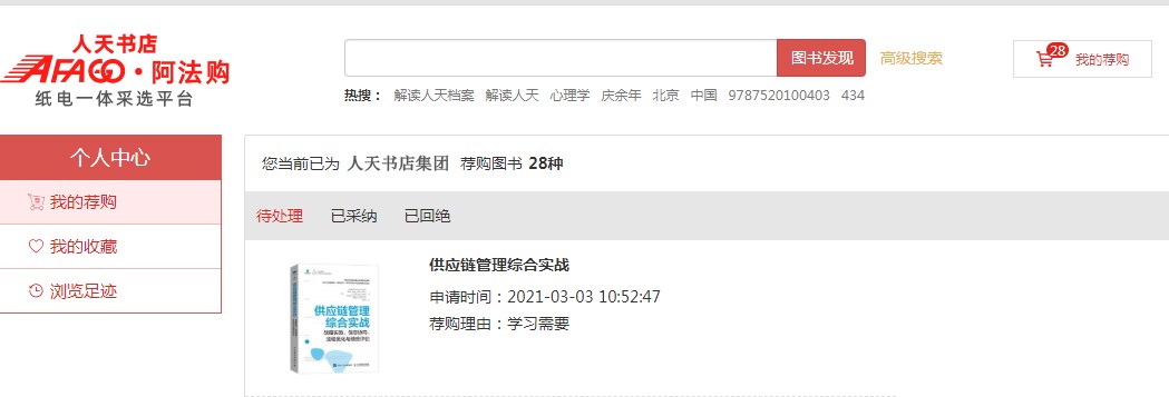 3、我的荐购:【个人中心】→【我的荐购】中可查看到所有的荐购书目,及图书馆的采纳情况。