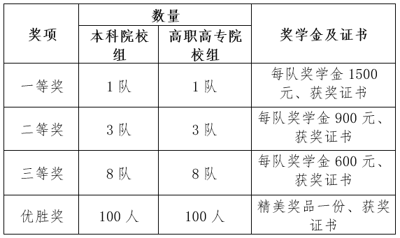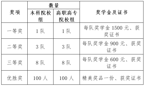 1.优秀组织奖:为激励各高校积极组织学生参与主题知识竞赛活动,主办方将根据各高校的参赛人数、成绩与活动组织情况,对本科院校、高职高专院校分别进行排名,评选优秀组织奖12所(本科院校组、高职高专院校组各6所)。