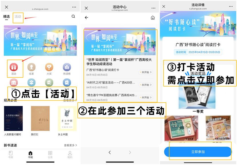 点击首页【活动】进入后即可参与阅读打卡、留言活动、PK答题活动