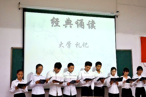 紧接着的是经典诵读动员活动,9名来自暮月文学社的社员和图书馆的助理衣着整齐,声音洪亮、感情饱满地朗诵了《礼记·大学》的节选片段,随后主持人宣读了经典阅读倡议书,号召学校各个社团能够积极地参与到即将举行的“五分钟经典诵读”活动中来。