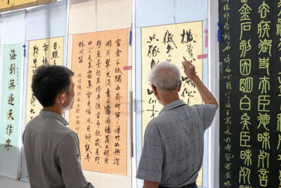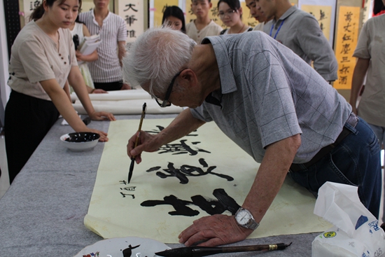 本次展出近百件主题鲜明、内涵丰富的书画作品。其书法或工整隽秀、或挥洒自如、或浑然古朴;绘画笔墨淋漓、激扬山河;作品集思想性、艺术性、观赏性于一体,导向正确,各具特色,具有较高的品味,不乏精品力作。前辈陆作洲老师和学生代表现场泼墨,赠予参观者。参观结束后,全体人员在图书馆门前集体诵读《大学》、《少年中国说》和《诫子书》等经典篇目。