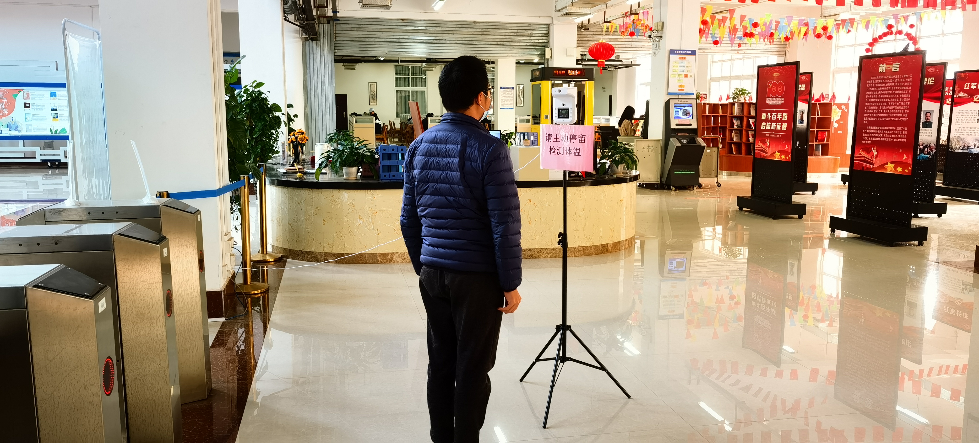 为确保读者的健康与安全,筑牢“疫情防线”,图书馆三楼设置体温检测处,并提醒读者出示健康码、戴口罩;在三楼大厅入口处和自助借还处设置一米线,指引读者不扎堆、不聚集,进入图书馆须保持1米以上距离,减少在馆停留时间;各门口设置防疫提示牌,加强阅览区和自修室的巡视管理,及时提醒读者做好个人防护措施,在馆自习期间须全程正确佩戴口罩,禁止在室内进食,降低馆内疫情发生和传播的风险,保障读者的健康安全。