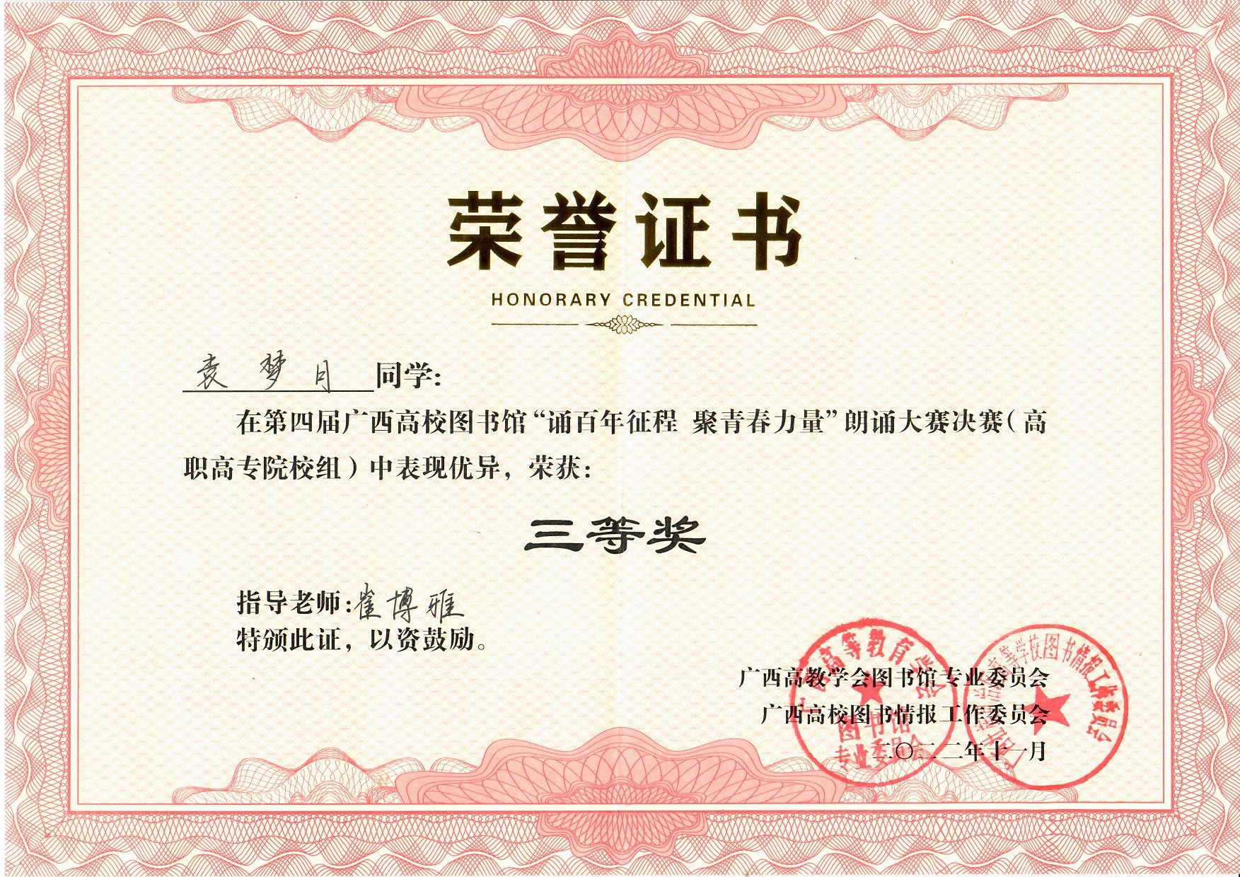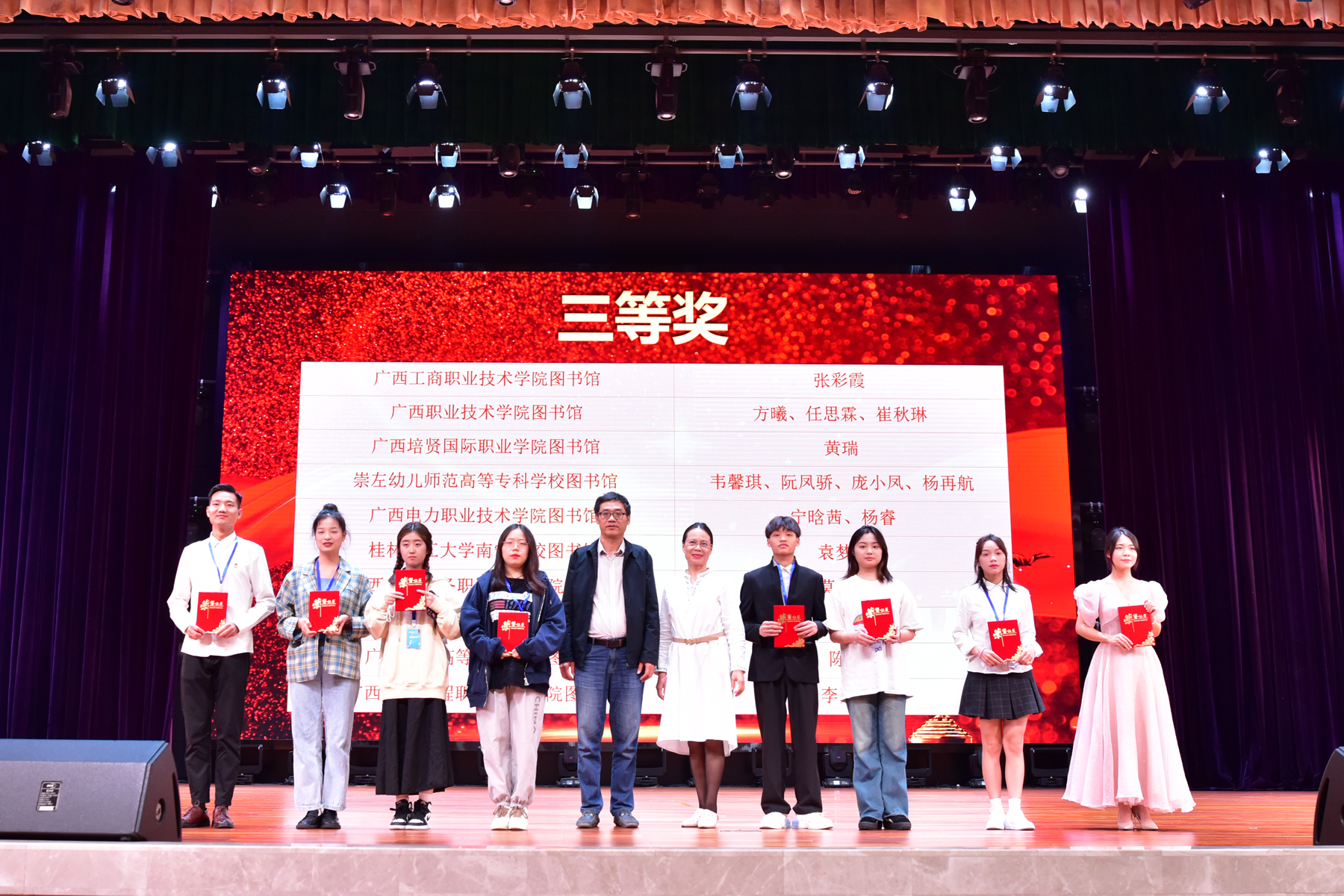 11月19日,由广西高教学会图书馆专业委员会与广西高校图书情报工作指导委员会主办、广西建设职业技术学院图书馆承办、全区各高校图书馆联合组织、武汉鼎森电子科技有限公司(博看网)协办的第四届广西高校图书馆“诵百年征程 聚青春力量”朗诵决赛在广西建设职业技术学院礼堂举行。