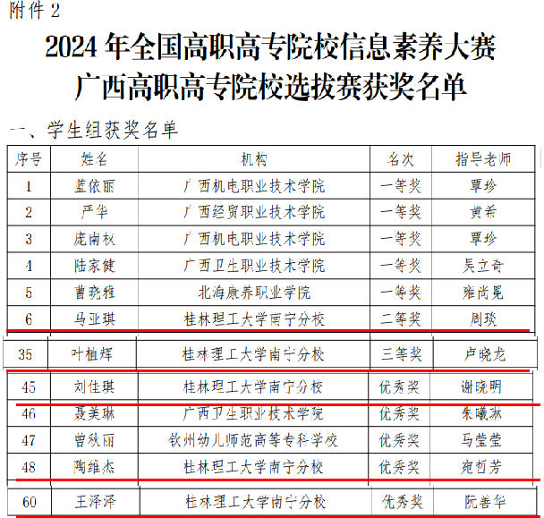 据悉,此次大赛由广西高教学会图书馆专业委员会与广西高校图书情报工作指导委员会共同主办,旨在落实《国家职业教育改革实施方案》《教育信息化2.0行动计划》和《关于加强新时代高技能人才队伍建 设的意见》等有关文件精神,进一步推动全国高职高专院校信息素养教育工作。本次比赛全区学生组共有28所院校参赛,比赛通过网络答题的方式进行。
