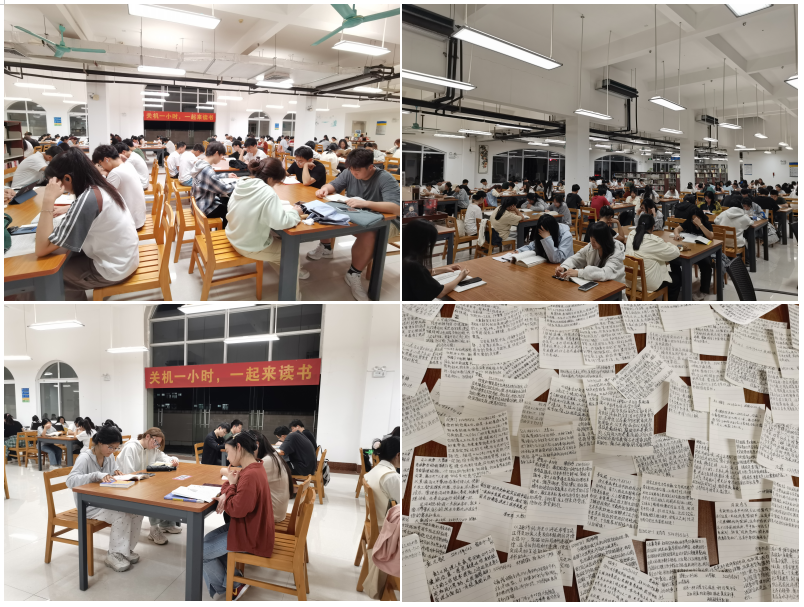 活动现场氛围热烈,吸引了超200名学生积极参与,参与人群覆盖面广,不仅有经济与管理学院的同学们踊跃参与,其他学院的同学们也热情加入,不同专业背景的思维在此汇聚碰撞。随着活动开启,同学们积极响应“关机一小时”的号召,果断将手机等电子设备调至静音或直接关机,随即迅速沉浸于经济类书籍的浩瀚海洋。他们时而低头沉思,时而轻声交流探讨。通过此次阅读活动,同学们不仅学到了许多经济管理领域的新知识,还真切感受到纸质阅读所带来的独特魅力与乐趣。经过一小时的专注阅读,学生们纷纷表示收获颇丰,并书写了阅读感言。