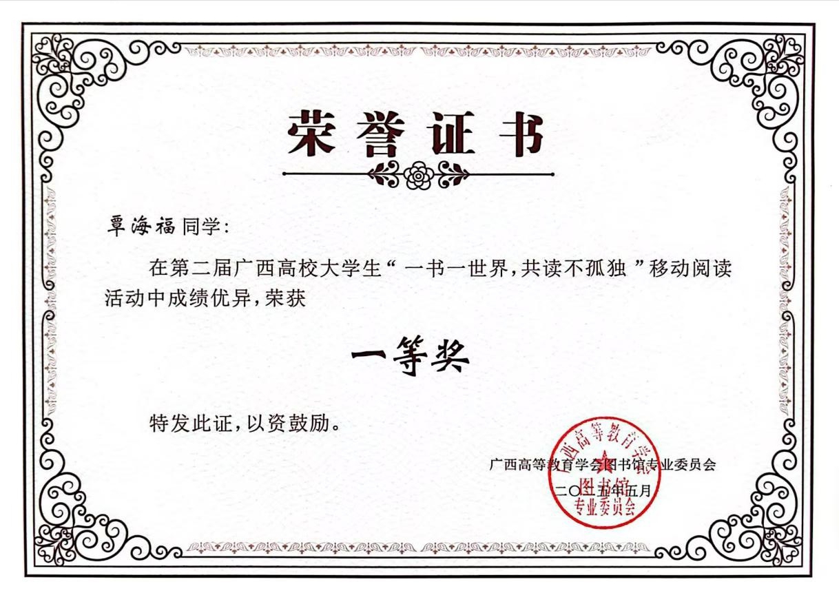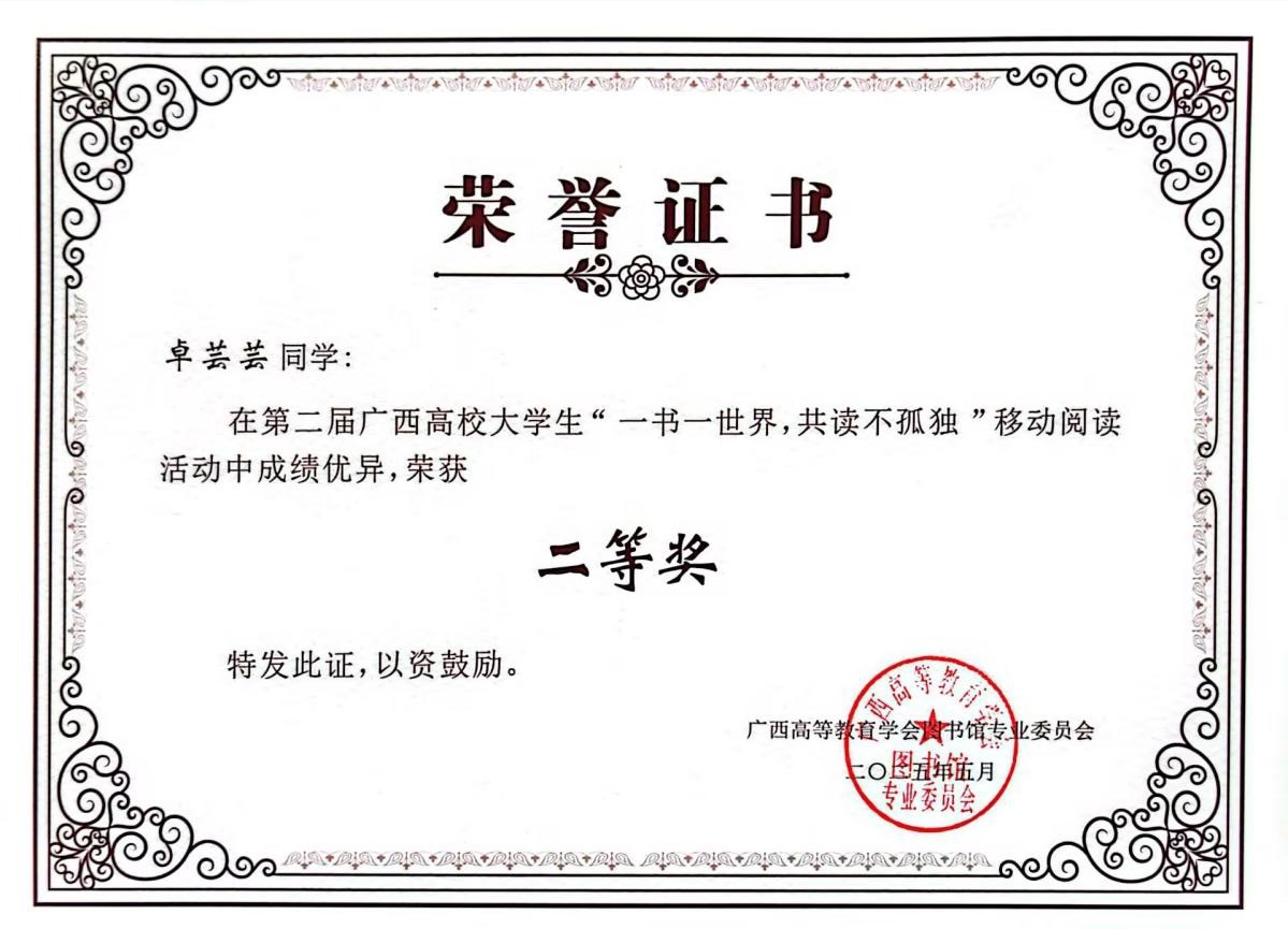 近日,从广西高等教育学会图书馆专业委员会传来喜讯,我校在第二届广西高校大学生“一书一世界,共读不孤独”移动阅读活动中表现优异,斩获多个荣誉奖项:覃海福同学荣获高职高专组一等奖,韦志芃、卓芸芸2名同学获得二等奖,太阳集团2138图书馆荣获“优秀组织奖”。