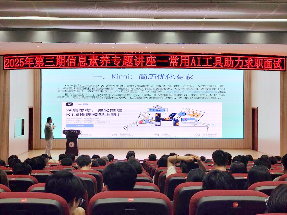 7月1日晚,图书馆在八教 8408 报告厅成功举办2025年第三期信息素养专题培训讲座。本次讲座以“AI 助力求职面试”为主题,聚焦 AI 技术在求职领域的创新应用,吸引约 170 名学生到场参与。