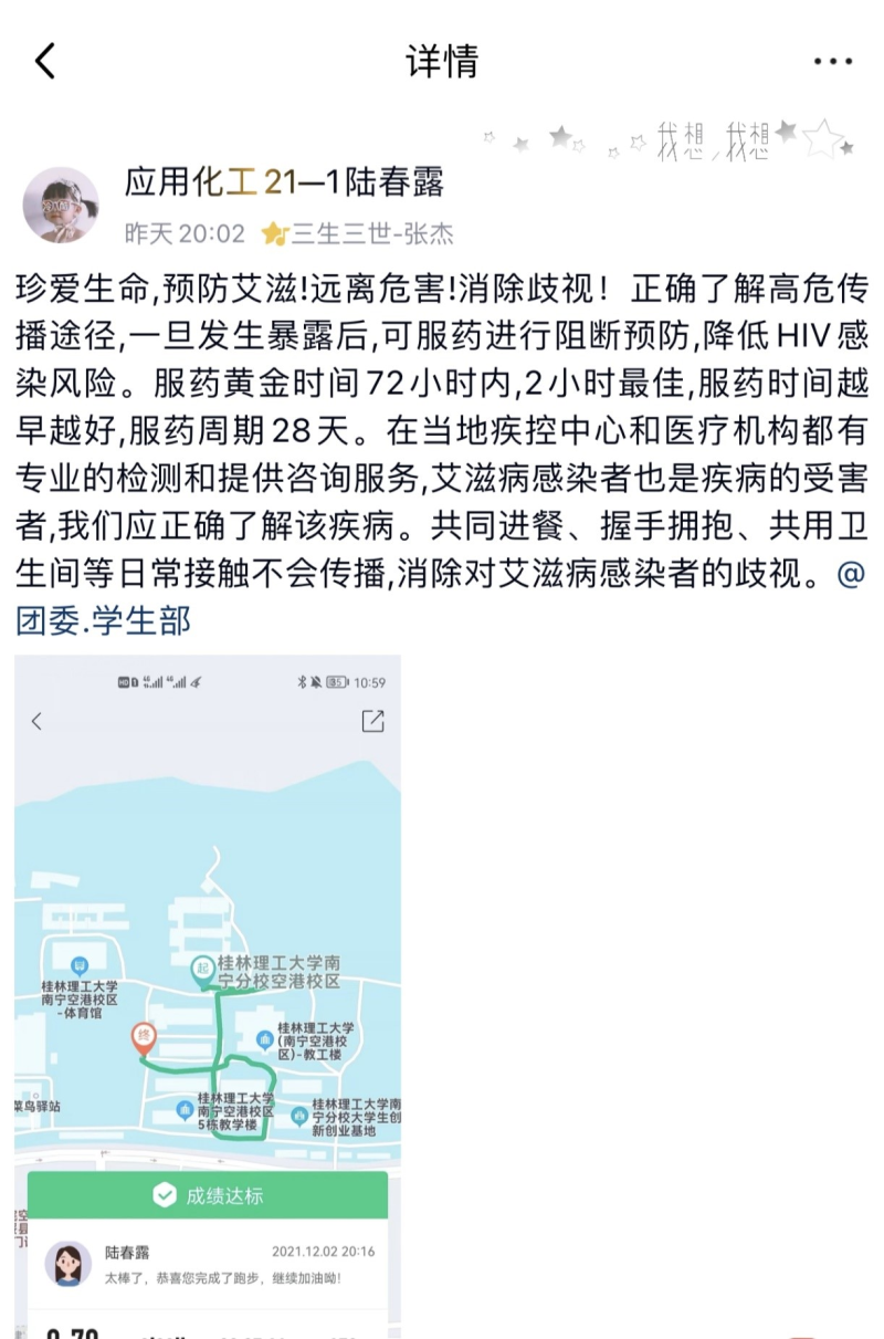 2021年12月1日下午17:30,秉承着向莘莘学子宣传“世界艾滋病日”的宗旨,分校团委以“线下横幅签名活动”拉开了预防艾滋病系列宣传活动的帷幕。由于同学们的大力支持,在活动开始后不久,横幅上便落满了生动俊逸的名字。迎着冷冽的寒风,他们认真地在“生命至上,终结艾滋,健康平等”和“预防艾滋病,你我共参与”两条横幅上写下自己的名字,脸上表现出对“世界艾滋病日”的敬意,仿佛是在宣誓抵御艾滋病的决心。在12月2日,分校团委陆续推出了以预防艾滋病为主题的征文活动、宣传画/手抄报以及畅跑健步三个活动。在活动过程中,我们收集到了图画作品115幅和178份活动征文。参与各项活动的学生不仅丰富了课外生活还在活动中深刻认识到了艾滋病传染途径以及预防知识,使广大桂工学子在潜移默化中受到了知识的熏陶,为全国普及预防艾滋病知识的工作推进献出了自己的一份力量。看着他们积极地参与这些活动,相信此番活动对同学们定会收获非凡。在“畅跑健步行,携手共参与”宣传活动中,据统计,共有822名同学们通过跑步或健步的方式将象征着全球人民对艾滋病病人的关心、支持,象征着世界人民对生命的热爱和对和平的渴望的“红丝带”给展现出来了,他们在用实际行动、身体力行地营造着一个健康美好地校园环境。12月5日,在同学们的热情支持下,预防艾滋病系列宣传活动圆满落幕了。
