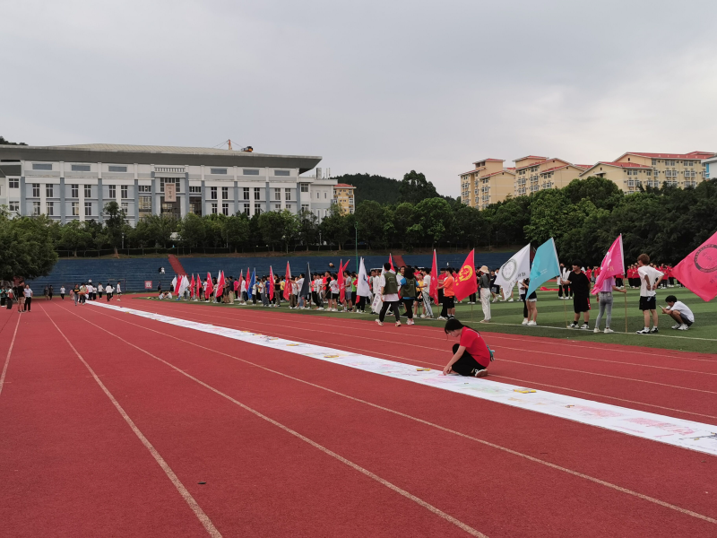 百年峥嵘岁月,百年初心如磐。在中国共产党成立100周年之际,为庆祝“七一”建党百年,分校团委于6月30日在田径场举行了“共绘百米画卷,献礼建党百年”主题团日活动。参与此次活动的有分校学工部主任韦宁照,团委书记黄薇薇、团委副书记谢欢、六系团总支书记以及六系学生代表、学生社团代表等800余人。
