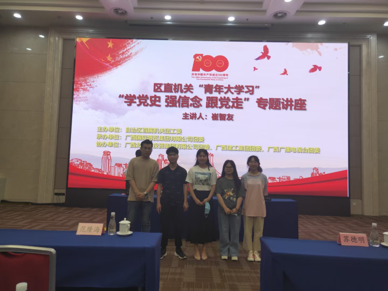 3月30日,分校团委于洋老师带领韩鲁浙等学生骨干一行五人参加共青团广西壮族自治区直属机关工作委员会举办的“学党史、强信念、跟党走”专题讲座,自治区法学会会长崔智友为区直机关广大团员青年作专题授课,要求区直机关广大团员青年厚植爱党、爱国、爱社会主义的情感。