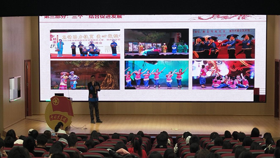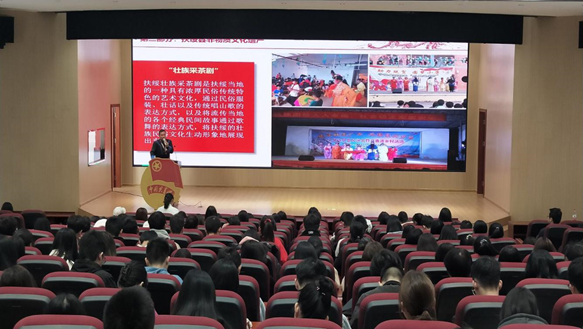 姚文老师讲解了此次讲座的相关内容,大家还观看了《全国民族团结进步表彰大会》现场视频,深切地体会到习近平主席对民族团结的重视。接着,姚文老师向大家介绍了扶绥县的非物质文化遗产并讲解汉、壮、瑶族结合扶绥采茶剧促进了当地的民族团结和谐社会进步发展的情况。