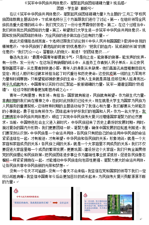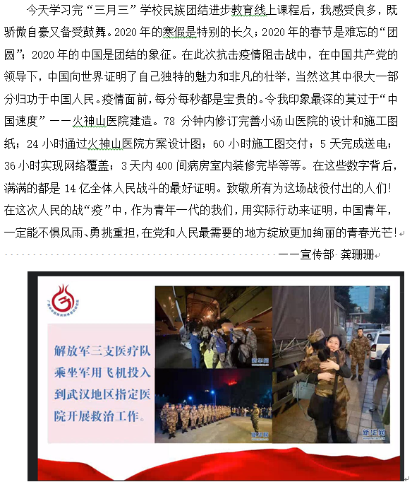 通过开展“三月三”学校民族团结进步教育主题活动,引导各族学生牢固树立“三个离不开”思想,不断增强“五个认同”,使同学们更加深刻地理解了民族团结进步教育是民族团结进步事业的基石,是新时代爱国主义教育的重要内容,为铸牢中华民族共同体意识夯实思想基础。在此次战“疫”中,中国展现了一个大国应对重大事件的反应速度与执行力,更体现了民族团结的精神。