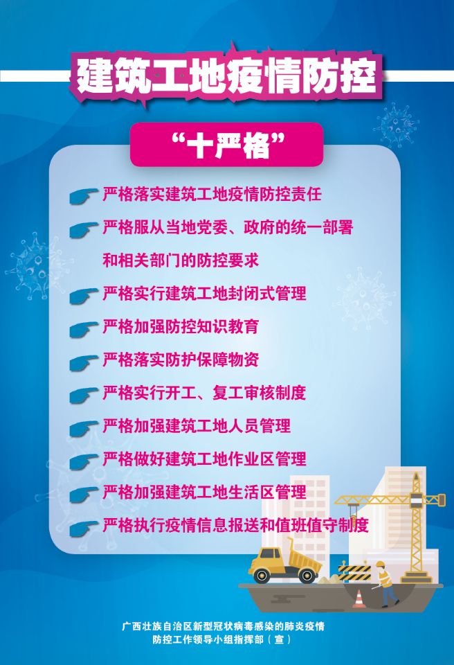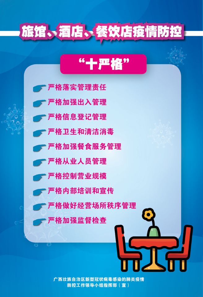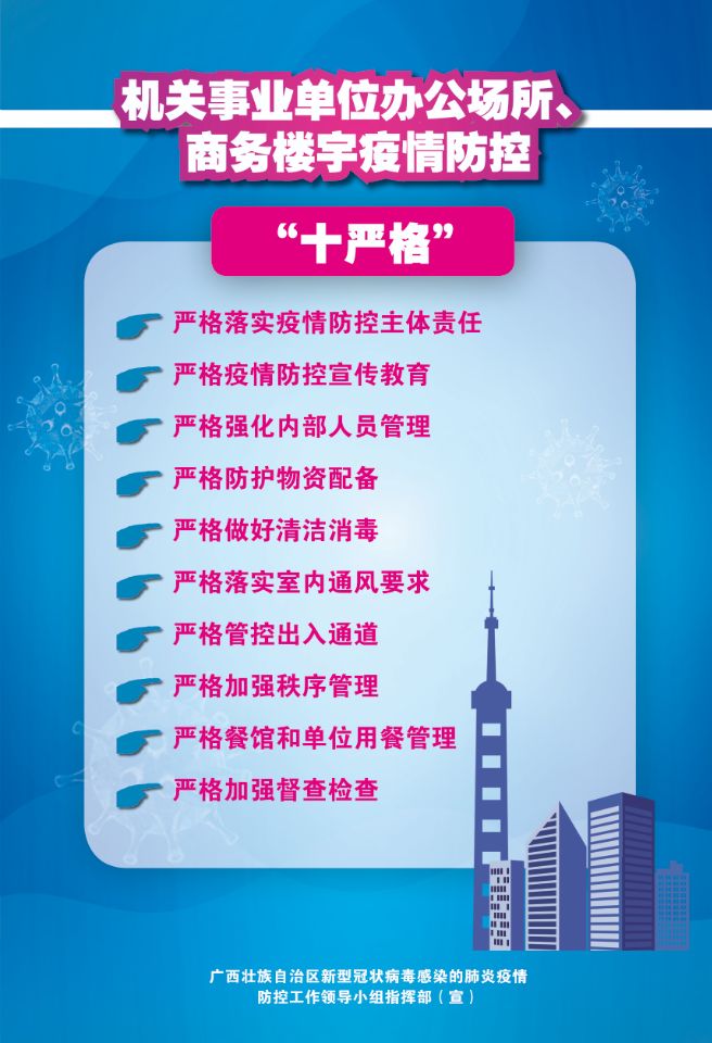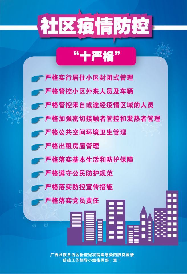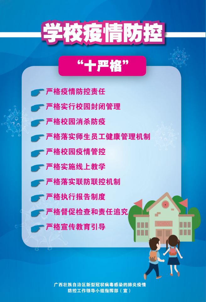 来源:广西壮族自治区新型冠状病毒感染的肺炎疫情防控工作领导小组指挥部关于印发学校疫情防控工作“十严格”的通知(网址链接:http://jyt.gxzf.gov.cn/gxjyt/zwgk/tzgg/23439.html)。