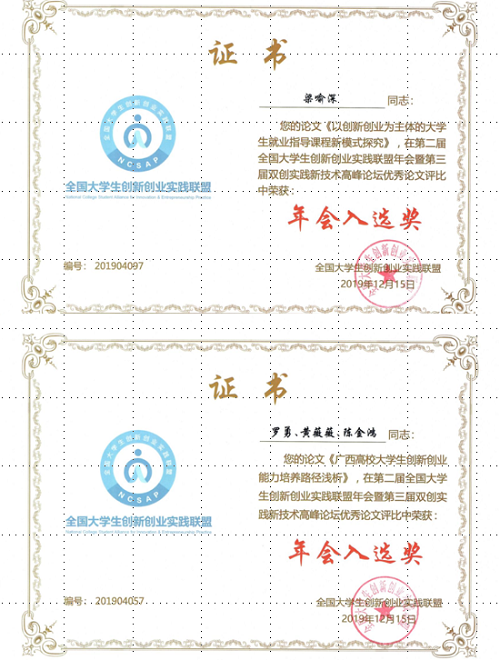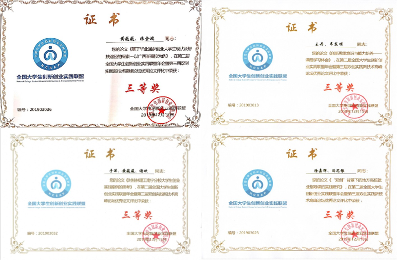 年会由校长论坛、高峰论坛、产教融合背景下专业建设分论坛、高校一流课程建设与创新人才培养分论坛、“双高计划”助力中国特色职业教育发展分论坛、优秀创新创业实践案例分享会暨创投资源对接会、大学生创新创业实践优秀案例展、创新创业教育示范高校及企业双创实践基地考察交流等一系列活动组成,并对全国高等学校创新创业教育工作中涌现出来的先进集体、先进个人和优秀论文等进行了表彰。我校推荐的工作案例《艺创“桂工情”·艺绘“中国梦”——桂林艺感文化创意有限责任公司创业案例》(指导老师:张萌萌)荣获优秀案例并在年会期间展示;论文《创新思维意识与能力培养——课程学习体会》(作者:王丹、韦龙明)、《“双创”背景下的地方高校就业指导课的实践研究》(作者:徐嘉辉、冯思豫)、《对桂林理工太阳集团2138大学生创业实践案例的思考》(作者:于洋、黄薇薇、谢欢)及《基于毕业回乡创业大学生现状及帮扶路径的探索---以广西某高校为例》(作者:黄薇薇、陈金鸿)荣获优秀论文三等奖;论文《广西高校大学生创新创业能力培养路径浅析》(作者:罗勇、黄薇薇、陈金鸿)《以创新创业为主体的大学生就业指导课程新模式》(作者:梁喻深)荣获年会论文入选奖;刘峥老师荣获“先进工作事迹”称号;学校被评为“优秀组织单位”,总体成绩再创新高。
