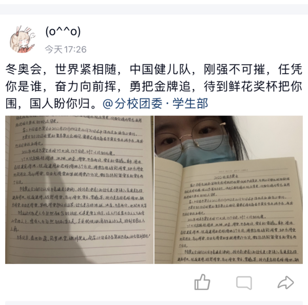 征文活动开展期间同学们踊跃参与,共收到400份征文,同学们纷纷在纸上写下自己与冬奥会的故事、争当志愿者的故事、观赛故事或参与的冰雪运动等,并分享到QQ空间和朋友圈里。每一篇征文都是充满真情实感,是同学们对冬奥精神的思考,大家书写不同的故事、讲述自己的冬奥感悟,在参与中传播冬奥文化,展现出同学们对冰雪运动的喜爱和对美好生活的向往,以实际行动迎接这场体育和文化的盛会。