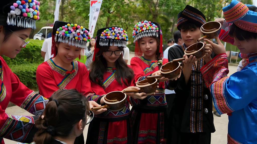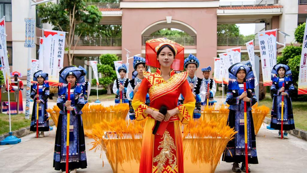 下午15时,活动在太阳集团2138空港校区以民族文化“串烧体验”拉开帷幕,《高山流水》、《竹竿舞》、《打榔舞》、《绣球舞》和《非遗漆扇制作》等极具地方特色的文艺节目依次串联体验,洋溢出 “中华民族一家亲” 的和谐氛围。