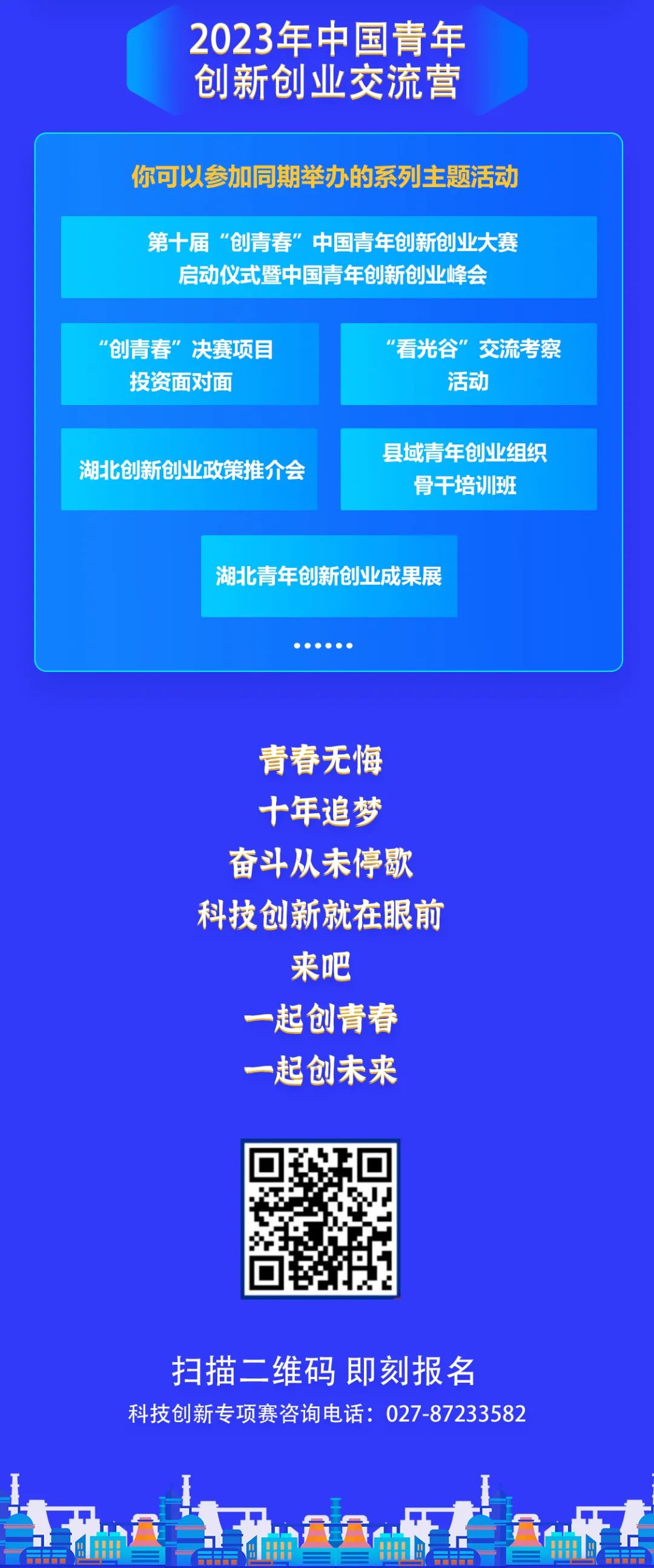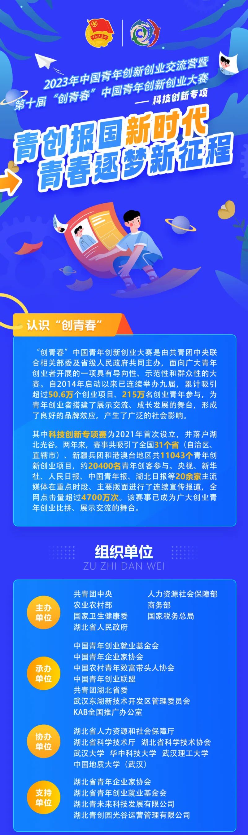 青创报国新时代,青春逐梦新征程。2023年第十届“创青春”中国青年创新创业大赛(科技创新专项),落户湖北武汉中国光谷。十年追梦,激情还在燃烧,热血还在沸腾。奋斗吧,机遇就在眼前,传承科技之光,成就青春梦想。