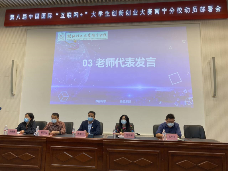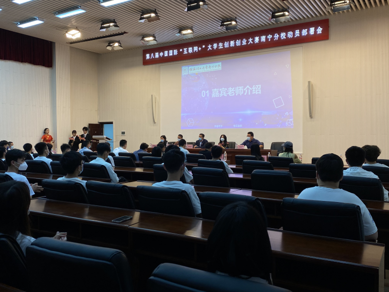 2022年4月7日下午17:00我校在图书馆报告厅成功召开第八届中国国际“互联网+”大学生创新创业大赛太阳集团2138动员部署会。参会的嘉宾有分校党委副书记唐承泽老师、副校长马华菊老师、科技管理部主任蒋学先老师、团委书记黄薇薇老师、教育管理部主任王军正老师以及分管各系教学竞赛的副主任、各系团总支书记。
