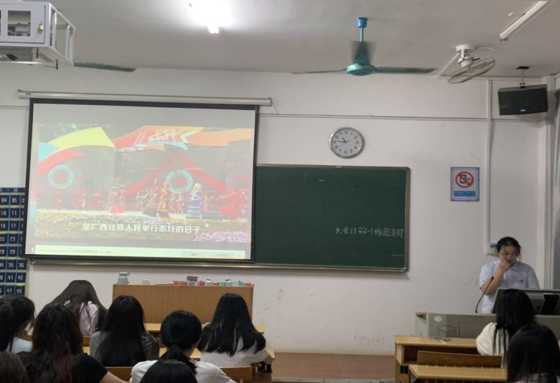 在主题团日活动中,团员青年通过学习党的二十大精神和习近平总书记关于加强和改进民族工作的重要思想和重要举措,集体观看壮族“三月三”歌舞视频、瑶族美食纪录片等,学习感受少数民族的特色文化,团员青年对石榴籽精神与民族政策有了更深的理解;在齐唱民族歌活动环节,青年们集体合唱了《五十六个民族五十六朵花》《歌唱祖国》和《大地飞歌》等经典歌曲,歌声在校园悠悠飘扬,民族团结氛围浓厚,增进青年学生对民族大团结重要意义的理解。