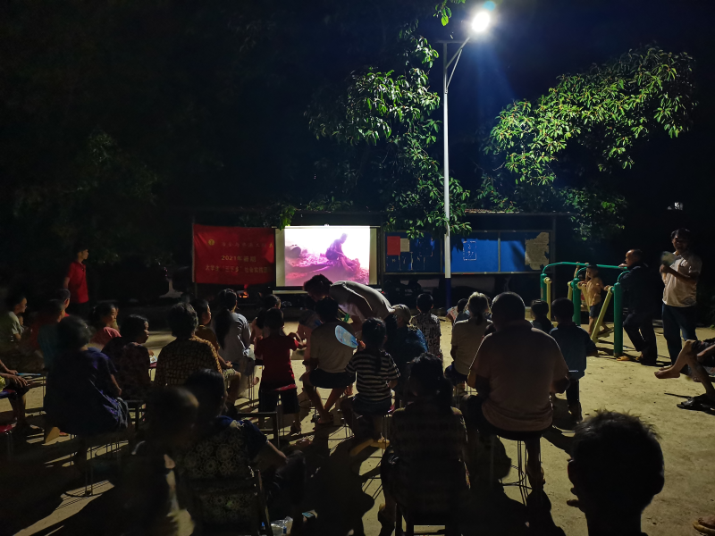 村民们在观看《血战湘江》红色电影