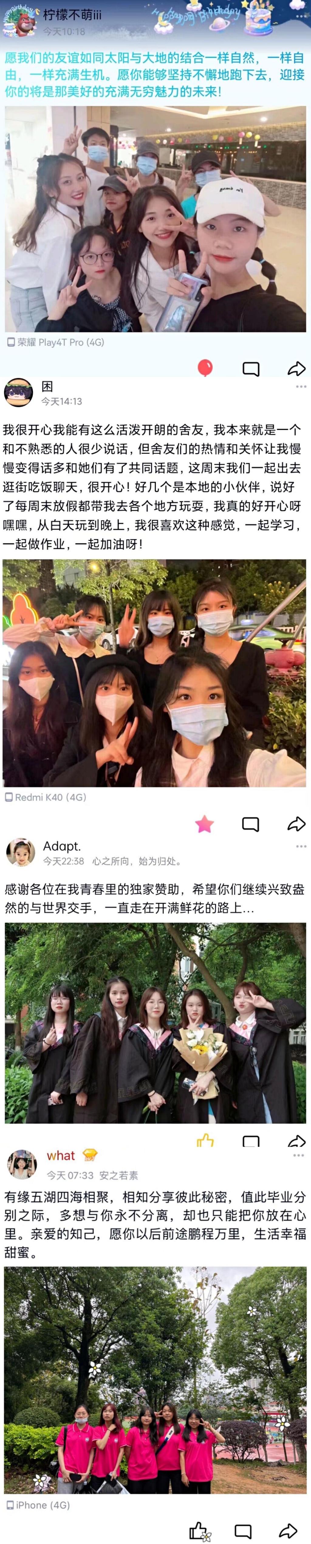 本次活动以线上形式开展,同学们在QQ空间或朋友圈等线上平台发布自己与宿舍成员间的合影照片。同学们穿上学士服等各类服装,在美丽的校园中留影,用独特的方式展示青春,用镜头留住大学时代的最后记忆和朝夕相处的同窗友谊。合照中一张张洋溢着青春与朝气的笑脸格外温馨,配文中一句句话语格外真挚,留言下一声声祝福格外珍重。同学们通过照片留下青春靓丽的身影、记录寝室之间深厚的友谊、在学习生活中的点滴日常,以及对桂工母校深深的留恋。