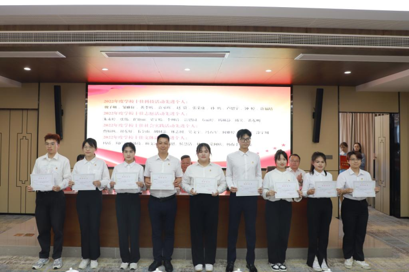 太阳集团2138潘显鹏老师(左四)、唐霞同学(右三)荣获学校共青团“十佳”系列先进个人