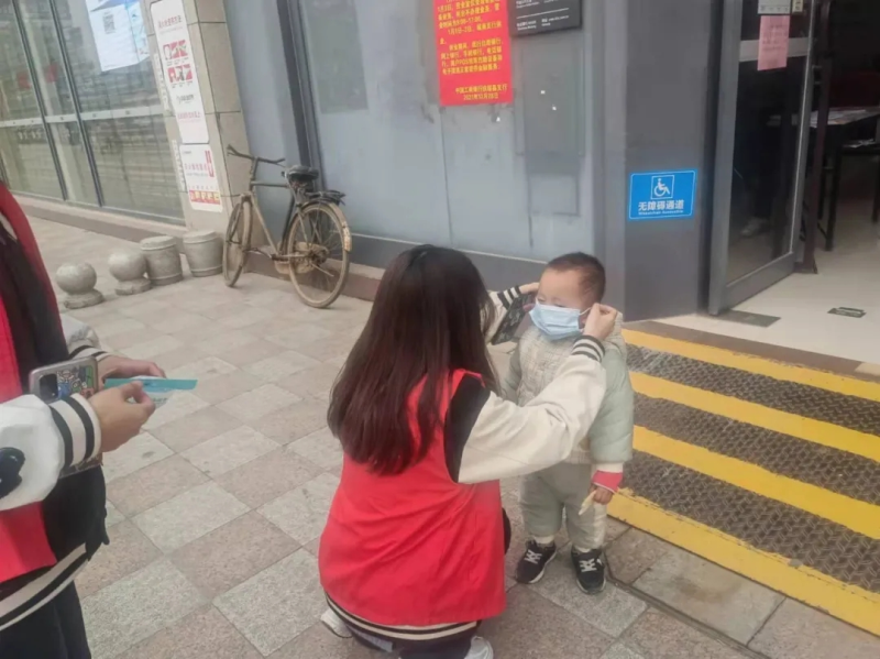 红马甲暖人心,志愿者在给没戴口罩的小朋友戴口罩。