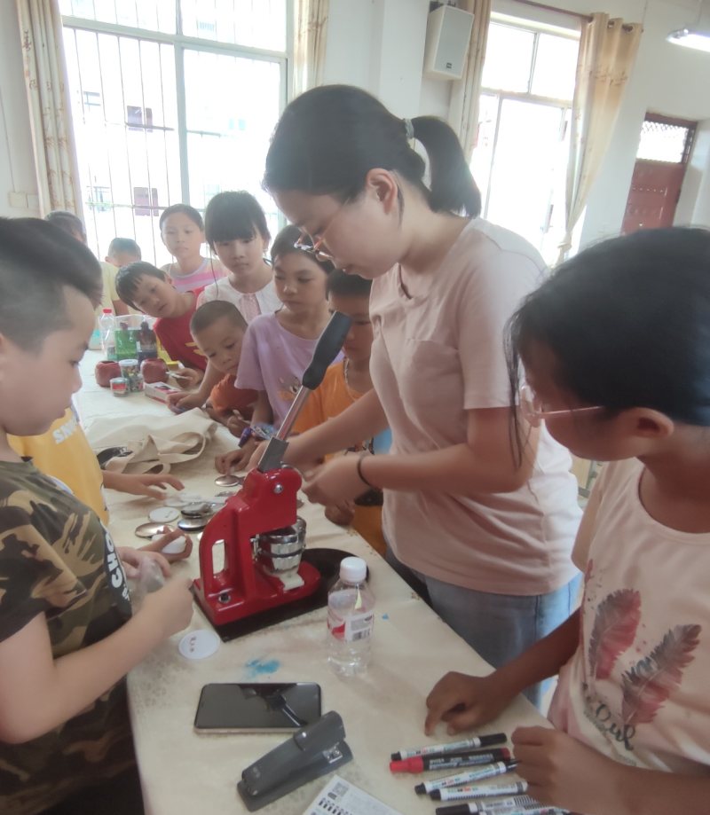 李肖然老师正在为小朋友制作徽章