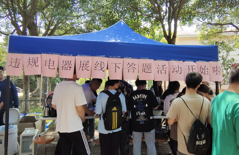 本次活动由违规电器展览、横幅签名、安全知识答题三部分组成,活动展出了一系列代表性的违规电器,如常见的电热锅、电饭锅、电热水壶、电热棒、取暖器、洗衣机等,吸引同学们纷纷驻足观看,切身了解使用违规电器的危害,积极参与安全知识答题。