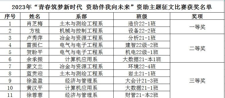 为深入学习贯彻党的二十大、全国两会和全国教育工作会议精神,贯彻落实全国学生资助管理中心《2023年学生资助工作要点》精神,大力宣传国家资助政策及成效,讲好中国学生资助故事,提升资助育人成效,进一步激励分校校受助学生奋发图强、立志成才,结合2023年学校“资助育人文化节”活动安排,决定在分校开展“青春筑梦新时代 资助伴我向未来”资助主题书法比赛,经系部推荐,学工部评审,现就获奖名单公布如下: