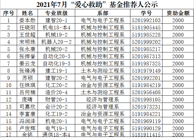 现将娄本勋等17名同学拟获得“爱心救助”基金在全校范围内公示,接受全校师生监督,公示期为3天(2021年7月23日-25日)。如对拟获得“爱心救助”基金对象的资助情况有异议,请于2020年7月25日下午4点前将意见以书面形式,并署真实姓名和联系方式,反馈到学生工作部。