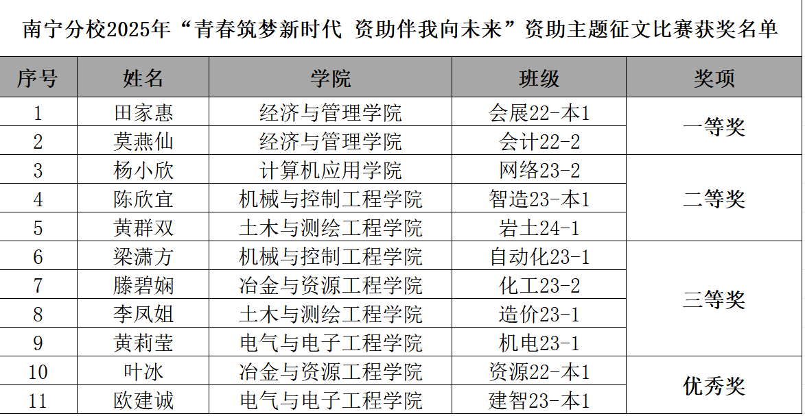 为进一步加大学生资助政策宣传力度,全面展示资助政策落实成效,加强对受奖助学生励志感恩教育,结合学校2025年“资助育人文化节”活动安排,决定在分校开展“青春筑梦新时代 资助伴我向未来”资助主题征文比赛,经学院推荐,学生工作办公室评审,现将获奖名单公示如下: