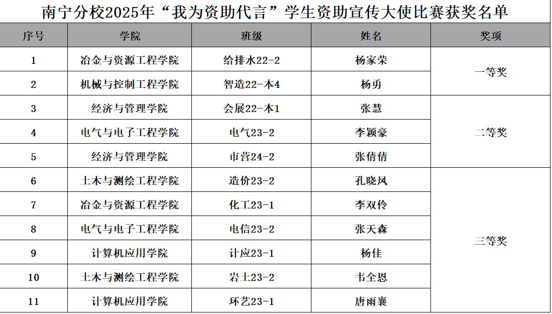 为加大学生资助政策宣传力度、扩大宣传效果,进一步提升受奖助学生能力素质,根据学校资助育人文化节活动安排,太阳集团2138认真组织开展了2025年“我为资助代言”学生资助宣传大使比赛。经学院推荐、现场演讲评分,共确定获奖学生11人,其中一等奖2人,二等奖3人,三等奖6人,现将获奖名单予以公示。