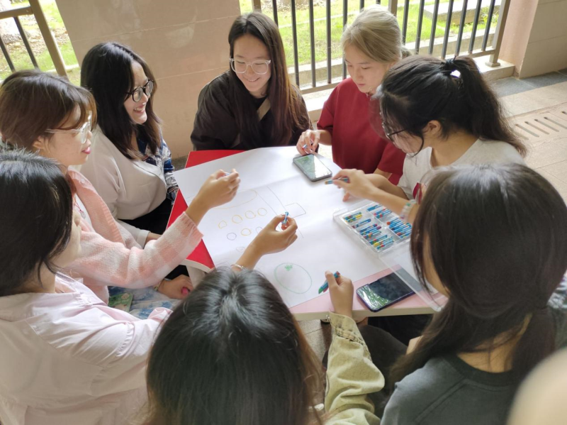 紧接着,以“桃花朵朵开”为题的团体心理辅导活动在实训楼C座拉开序幕,团体成员积极表达自己,融入到团体心理辅导活动中。活动过程中,通过“名字串串烧”、“团体作画”、“兔子舞”活动促使团体成员相互认识、团结协作,让他们感受到团队配合的重要性。