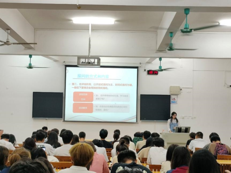 本次培训主要由心理健康教育与咨询中心和心理健康教育教研室的黄观媛、阮青霞、黎冬艳、黄霞妮四位老师分别围绕“心理委员的职责与技能”、“团体心理辅导的设计与实施”、“学会朋辈辅导,走进你我心灵”、“会谈的技巧”等四个方面进行详细讲解,并就现场心理委员们提出的疑问进行了交流与解答。