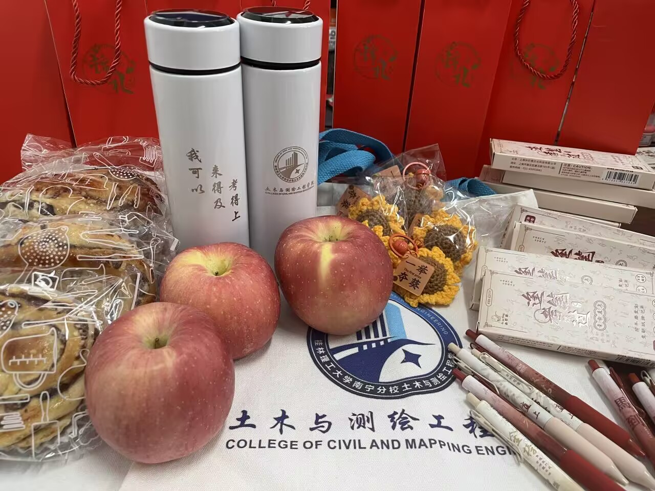 学院为考研学子精心准备的考研慰问品,分两次发放,包含着学院老师们以及学弟学妹们诚挚的祝福与温暖的问候。每一份礼包中都有一份祝福卡片,祝愿每一位考研学子取得优异成绩,升入理想学府,这些卡片或出自老师之手,或出自学弟学妹之手,设计精美、包装精良、文字感人。慰问礼包内还装有满满当当、寓意深刻的考试文具、袜子、钥匙扣零食与水果组合,为同学们补充营养和加满能量。