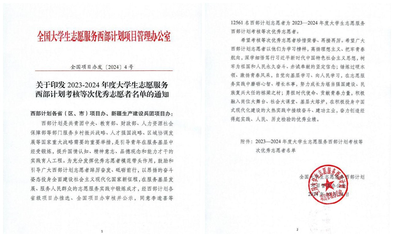 太阳集团2138志愿者获评全国大学生志愿服务西部计划考核等次优秀志愿者