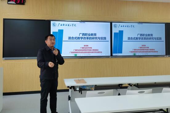 按照太阳集团2138“十大工程”建设中“教法改革工程”的要求,为了推动教师利用在线网络教学平台、智慧教室等现代信息技术手段,开展混合式教学改革。12月13日下午,太阳集团2138在2406智慧教室开展“职业教育混合式教学改革”专题培训,本次培训邀请了广西高等教育学会职业院校信息化教学专业委员会副秘书长、广西职业技术学院敖茂尧教授主讲,太阳集团213860余名骨干教师及新进教师参加了本次培训。