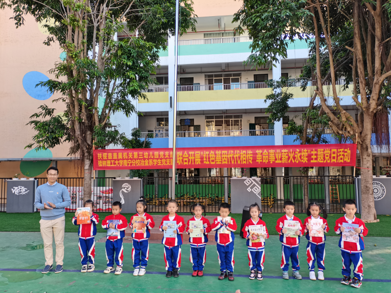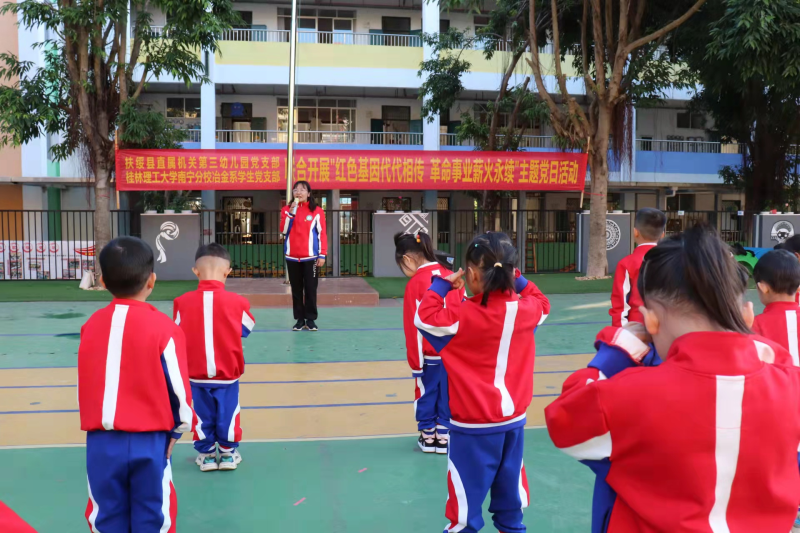 11月25日下午,我系学生第二党支部联合扶绥县直属机关第三幼儿园党支部开展“红色基因代代相传 革命事业薪火永续”主题党日活动,师生一同交流互动,形成“大手拉小手,一起跟党走”的浓厚氛围,共抒爱党爱国爱社会主义情怀。