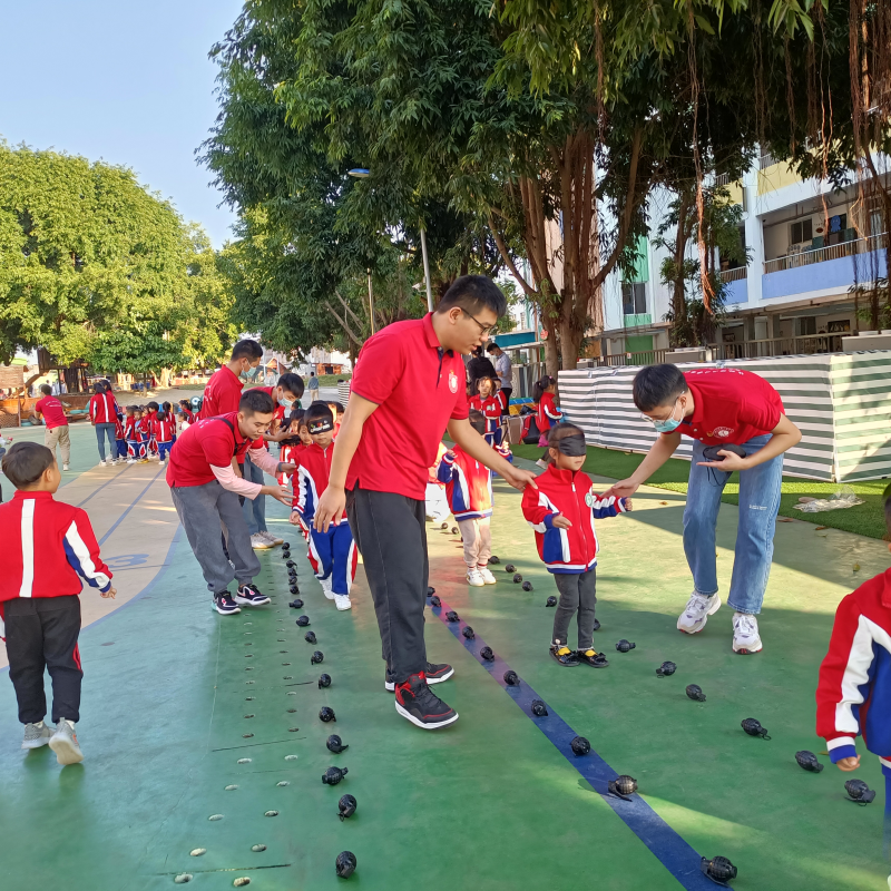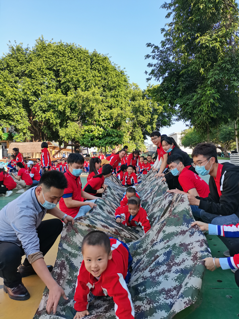 在另外一块场地上,师生通力配合,和小朋友一同开展“彩虹滑道”“抢球大作战”“丢沙包”“勇闯雷阵”互动游戏。活动场面热闹非凡,小朋友们尽情地玩耍,享受着快乐的幼儿时光。脸上洋溢着笑容,抵消了师生付出的汗水。