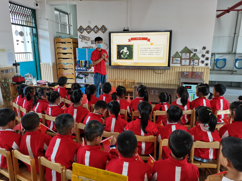 红色经典小故事讲述结束后,学生党员们和小朋友们在富有节奏的互动中一同歌唱《红星闪闪》《国旗国旗多美丽》和《祖国祖国我们爱你》红色歌曲。嘹亮的歌声响彻幼儿园上空,饱含感情地唱出了我爱祖国、童心向党的心声。