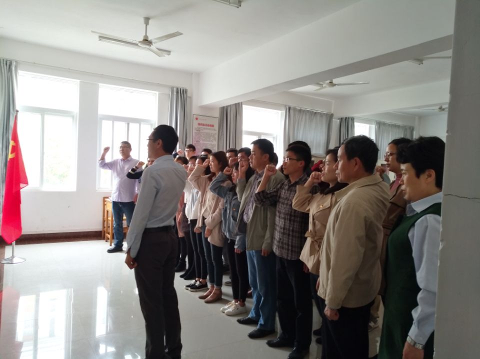 在活动开始后,全体师生党员佩戴好闪亮而沉重的党徽,纷纷足额交纳了党费。随后,面对悬挂的鲜红的中国共产党党旗,系党总支书记石有总带领全体师生党员同志一起重温入党誓词。在石书记的领誓下,全体师生党员发出了铿锵有力的宣誓声,表达了要不忘初心,牢记使命,积极工作,为党的教育事业奋斗终身的决心。
