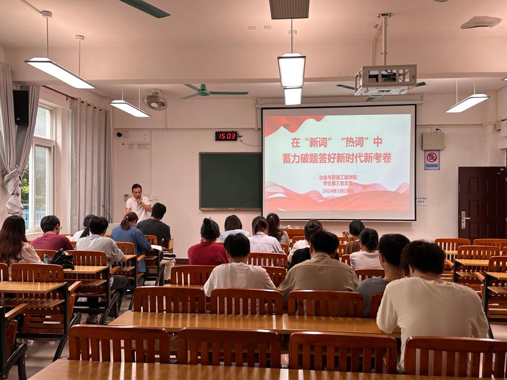 为全面贯彻落实习近平新时代中国特色社会主义思想,进一步准确把握并深刻领会全国两会精神实质和内涵要义。3月29日下午,学生第三党支部在探源楼5205教室开展在“新词”“热词”中蓄力破题答好新时代新考卷专题党课,支部副书记余远江为全体师生党员授课。