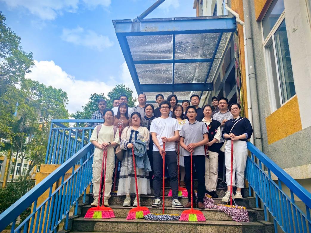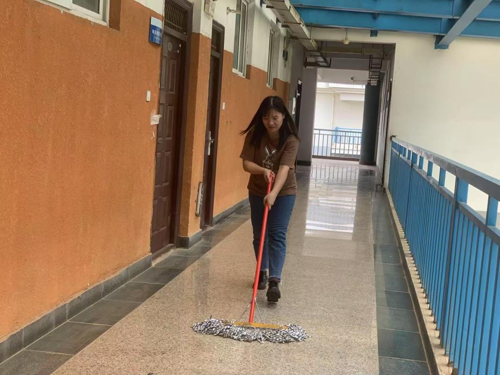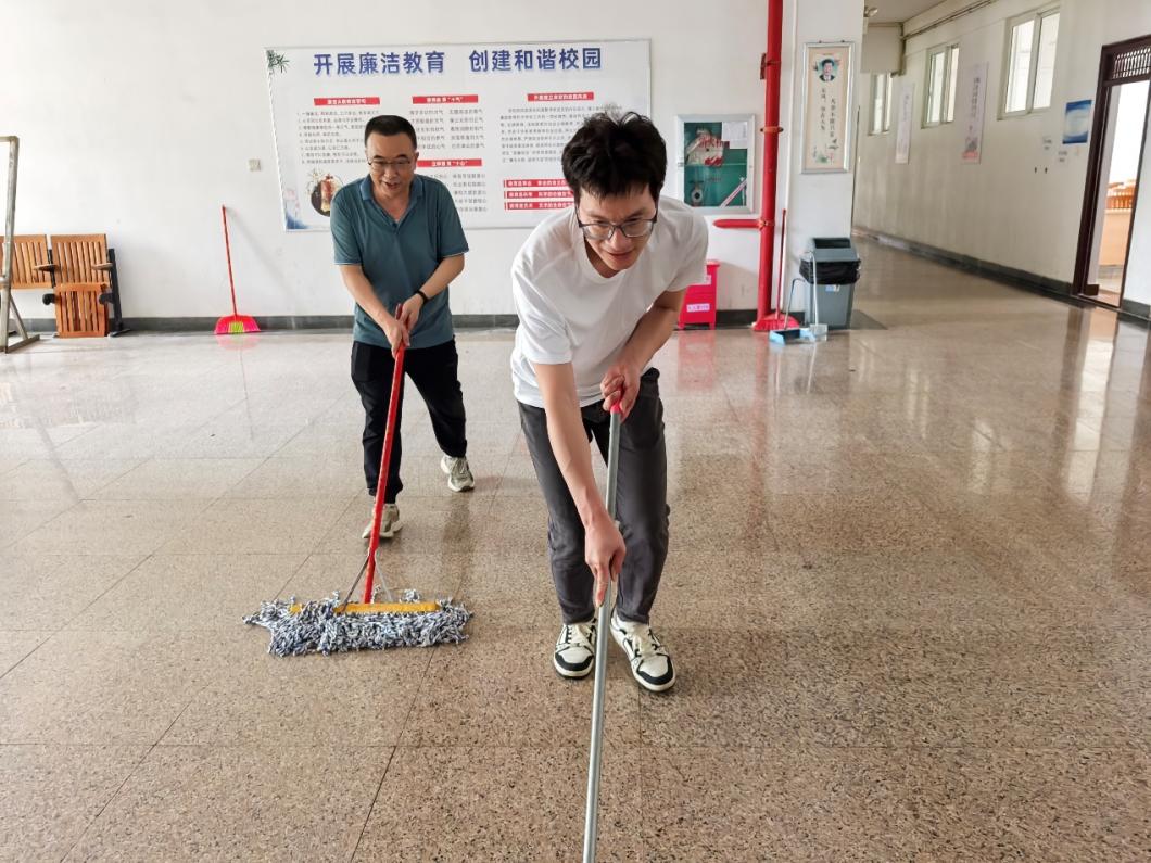 下午2时30分,支部全体党员佩戴党徽,自带扫帚、拖把等清洁工具在5号教学楼前集合开工。党员教师们重点清理了教室地面顽固污渍、擦拭多媒体设备积尘、整理走廊,并对卫生间、楼梯扶手等公共区域进行深度清洁。经过两个多小时劳动,五号教学楼门窗明亮、桌椅整齐,教学环境焕然一新。