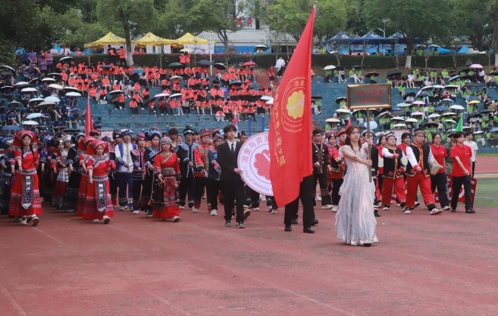 开幕式上,国旗队、会旗队迈着整齐有力的步伐率先入场。随后,我院方块队和表演队依次步入会场,队员们身着绚丽多彩的民族服饰,通过独具创意的表演,生动展示了各少数民族的文化特色,为现场观众带来了一场精彩的视觉盛宴。